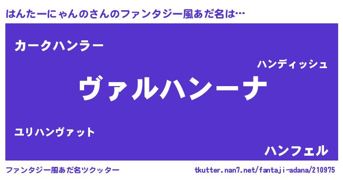 | 男性向けラノベタイトル風あだ名 | 『この素晴らしい世界にはんたーにゃんのを!』 |