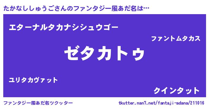 | 男性向けラノベタイトル風あだ名 | 『Re:たかなししゅうごから始める異世界生活』 |