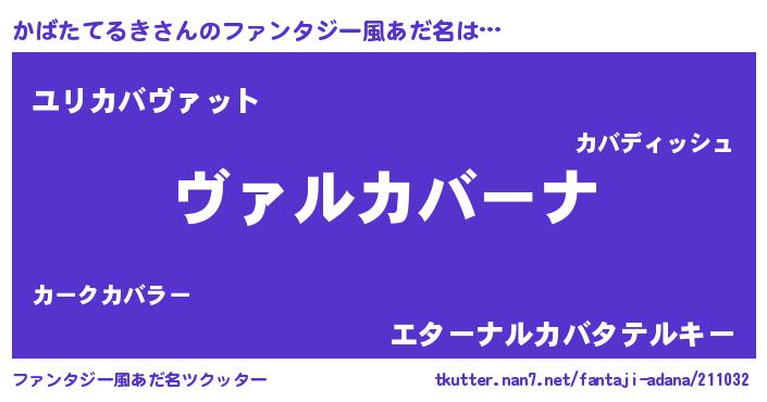 | 男性向けラノベタイトル風あだ名 | 『魔弾の王とかばたてるき』 |