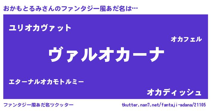 | 男性向けラノベタイトル風あだ名 | 『魔弾の王とおかもとるみ』 |