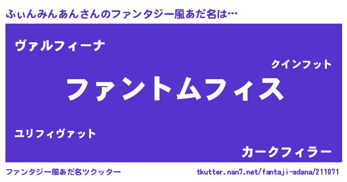 | 女子向けラノベタイトル風あだ名 | 『ふぃんみんあんの卵を拾いまして』 |