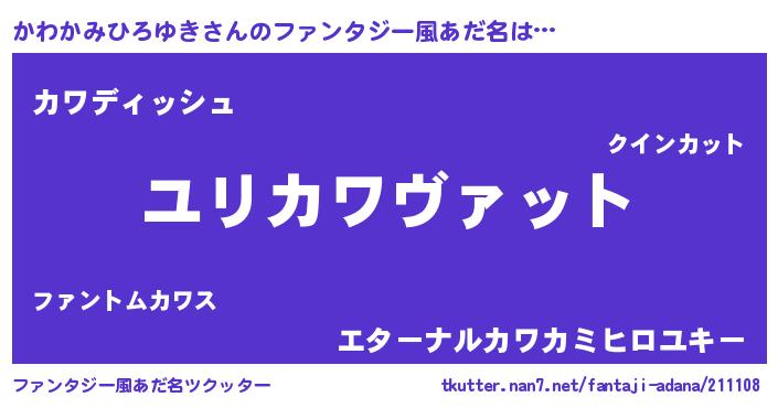 | 男性向けラノベタイトル風あだ名 | 『かわかみひろゆき~年齢イコール彼女いない歴の魔法使い~』 |