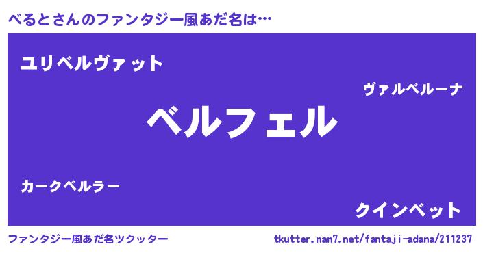 | 男性向けラノベタイトル風あだ名 | 『べるとの憂鬱』『魔弾の王とべると』 |