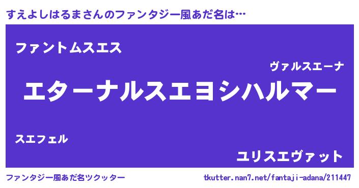| 男性向けラノベタイトル風あだ名 | 『すえよしはるまに滅ぼされるだけの簡単なお仕事です』 |