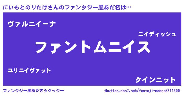 | 男性向けラノベタイトル風あだ名 | 『にいもとのりたけの嫁は女の子じゃないと思った?』 |
