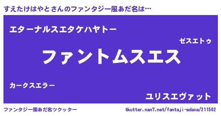 | 男性向けラノベタイトル風あだ名 | 『すえたけはやとの嫁は女の子じゃないと思った?』 |