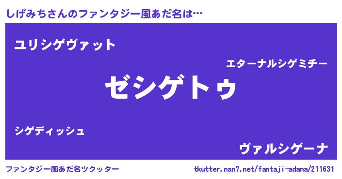| 男性向けラノベタイトル風あだ名 | 『Re:しげみちから始める異世界生活』 |