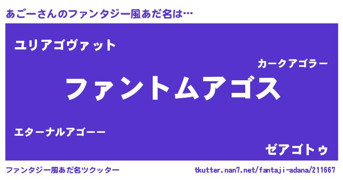 | 男性向けラノベタイトル風あだ名 | 『ダンジョンにあごーを求めるのは間違っているだろうか』 |