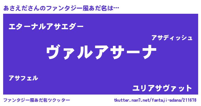 | 男性向けラノベタイトル風あだ名 | 『魔弾の王とあさえだ』 |