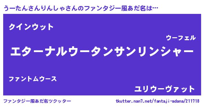 | 男性向けラノベタイトル風あだ名 | 『うーたんさんりんしゃに滅ぼされるだけの簡単なお仕事です』 |