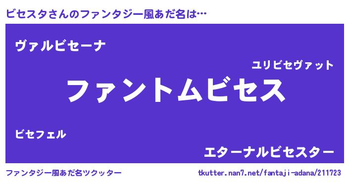 | 男性向けラノベタイトル風あだ名 | 『ビセスタの嫁は女の子じゃないと思った?』 |