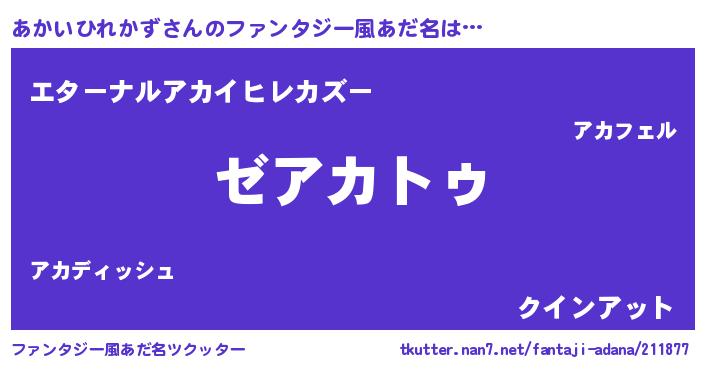 | 男性向けラノベタイトル風あだ名 | 『Re:あかいひれかずから始める異世界生活』 |