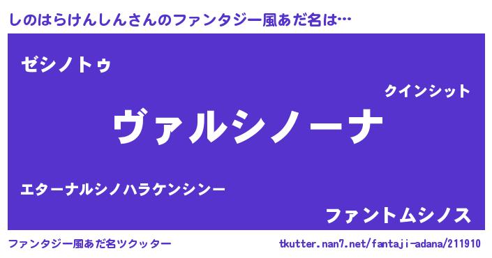 | 男性向けラノベタイトル風あだ名 | 『この素晴らしい世界にしのはらけんしんを!』 |