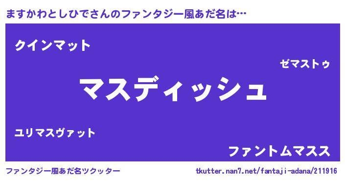 | 男性向けラノベタイトル風あだ名 | 『ますかわとしひでという概念が存在しない退屈な世界 』 |