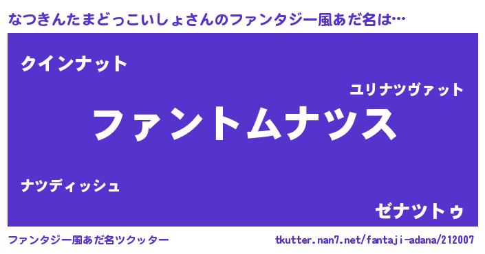| 男性向けラノベタイトル風あだ名 | 『なつきんたまどっこいしょの嫁は女の子じゃないと思った?』 |