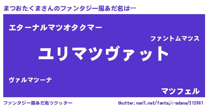 | 男性向けラノベタイトル風あだ名 | 『まつおたくま~年齢イコール彼女いない歴の魔法使い~』 |