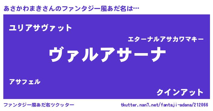 | 男性向けラノベタイトル風あだ名 | 『魔弾の王とあさかわまき』 |