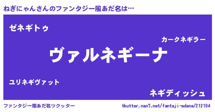 | 男性向けラノベタイトル風あだ名 | 『この素晴らしい世界にねぎにゃんを!』 |