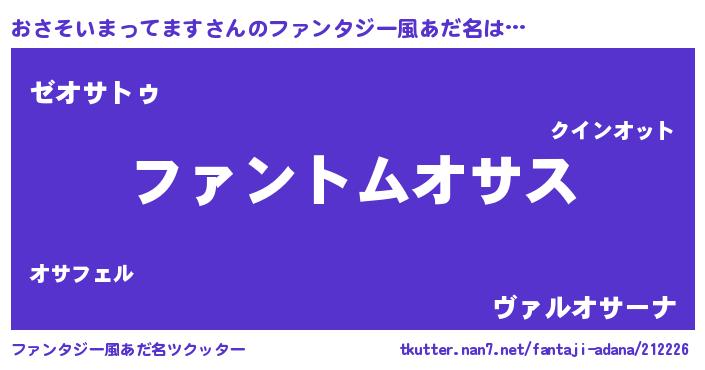 | 男性向けラノベタイトル風あだ名 | 『おさそいまってますの嫁は女の子じゃないと思った?』 |