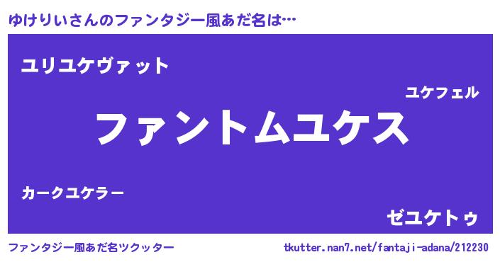| 女子向けラノベタイトル風あだ名 | 『ゆけりいの卵を拾いまして』 |