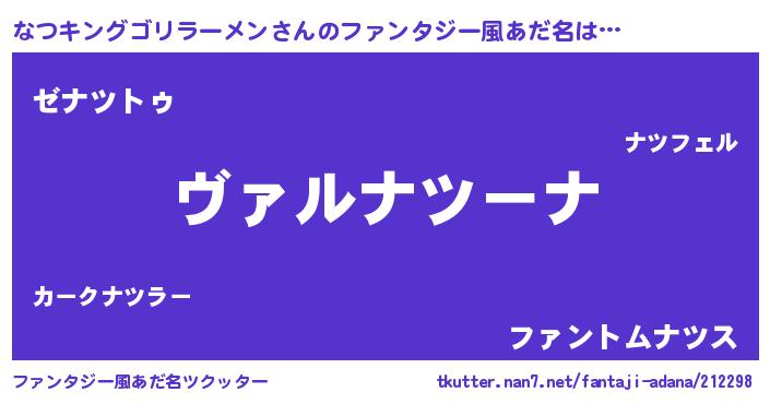 | 男性向けラノベタイトル風あだ名 | 『この素晴らしい世界になつキングゴリラーメンを!』 |