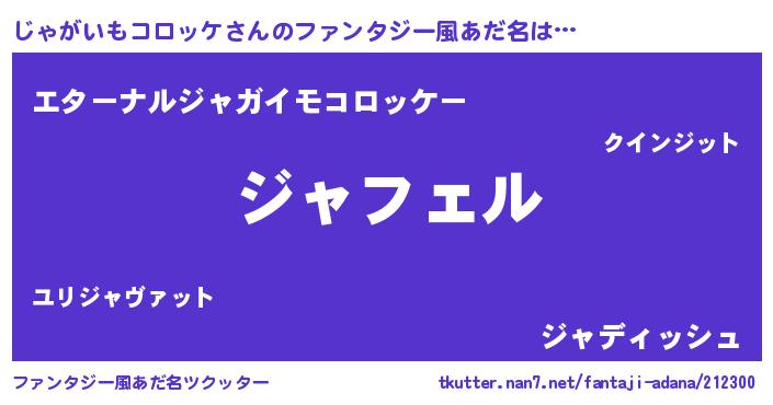 | 男性向けラノベタイトル風あだ名 | 『じゃがいもコロッケの憂鬱』 |