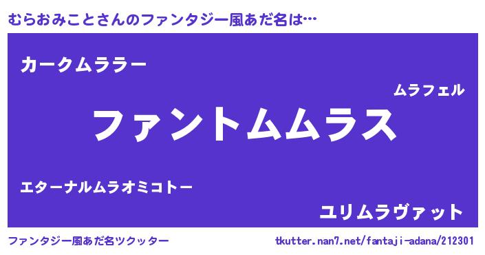 | 男性向けラノベタイトル風あだ名 | 『むらおみことの嫁は女の子じゃないと思った?』 |