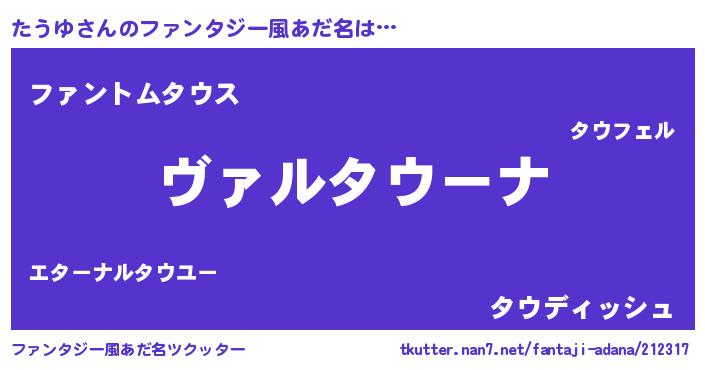 | 男性向けラノベタイトル風あだ名 | 『魔弾の王とたうゆ』『たうゆの憂鬱』 |