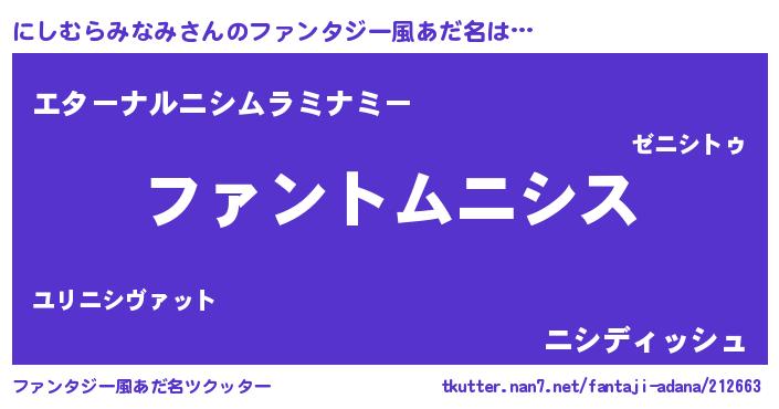| ポケモン風あだ名 | 『ヒニシムラミナミ』『ニシムダネ』 |