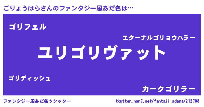 | 男性向けラノベタイトル風あだ名 | 『ごりょうはら~年齢イコール彼女いない歴の魔法使い~』 |