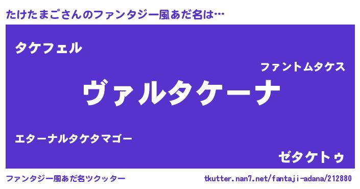 | 男性向けラノベタイトル風あだ名 | 『魔弾の王とたけたまご』 |