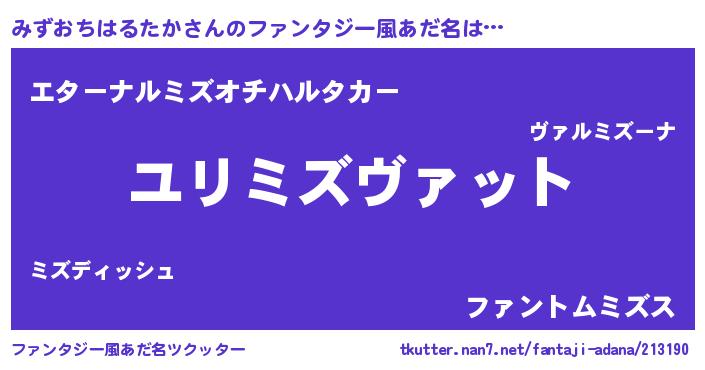 | 男性向けラノベタイトル風あだ名 | 『みずおちはるたか~年齢イコール彼女いない歴の魔法使い~』 |