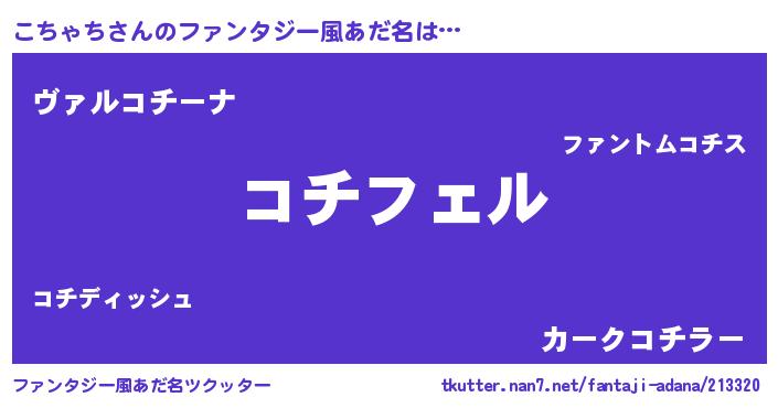 | 男性向けラノベタイトル風あだ名 | 『コチャチアートオンライン』 |
