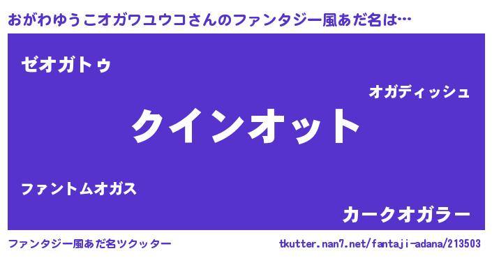| 男性向けラノベタイトル風あだ名 | 『おまえをオタクにしてやるから、俺をおがわゆうこオガワユウコにしてくれ! 』 |