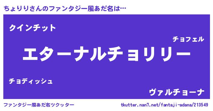 | 男性向けラノベタイトル風あだ名 | 『ちょりりに滅ぼされるだけの簡単なお仕事です』 |