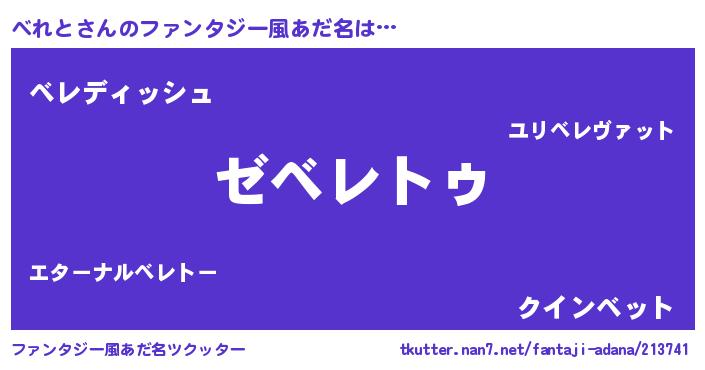 | 男性向けラノベタイトル風あだ名 | 『Re:べれとから始める異世界生活』 |