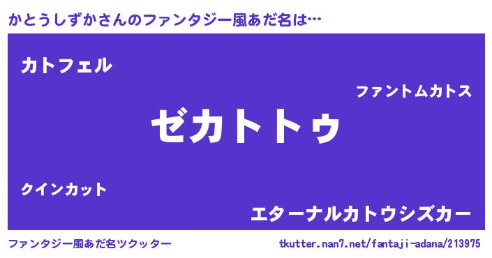 | 男性向けラノベタイトル風あだ名 | 『Re:かとうしずかから始める異世界生活』 |