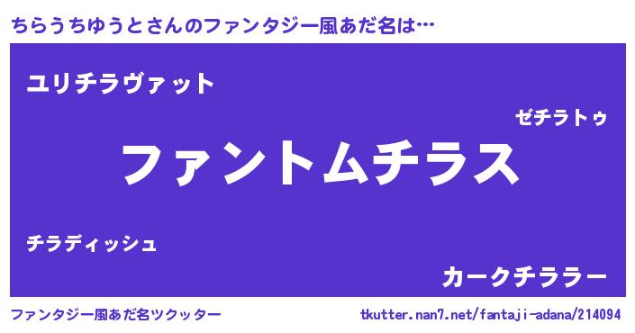 | 男性向けラノベタイトル風あだ名 | 『ちらうちゆうとの嫁は女の子じゃないと思った?』 |