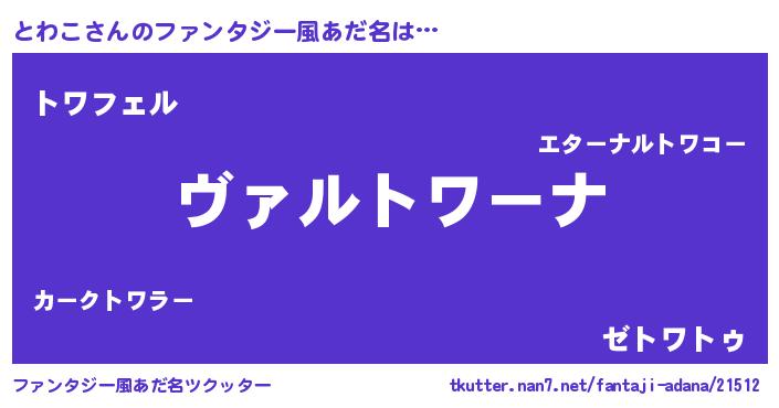 | 男性向けラノベタイトル風あだ名 | 『魔弾の王ととわこ』『とわこの憂鬱』 |