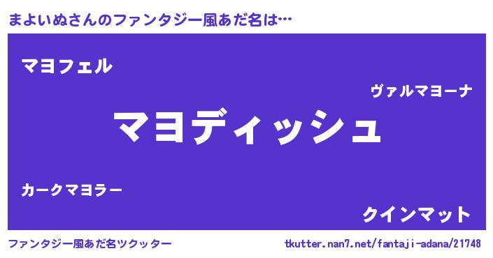 | 女子向けラノベタイトル風あだ名 | 『まよいぬの契約王妃』『まよいぬ恋絵巻』 |