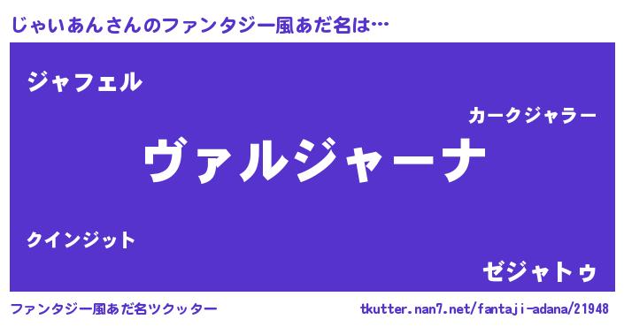 | 男性向けラノベタイトル風あだ名 | 『魔弾の王とじゃいあん』 |