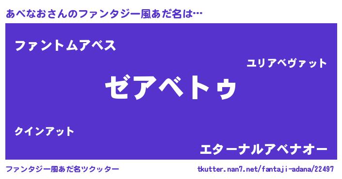 | 男性向けラノベタイトル風あだ名 | 『Re:あべなおから始める異世界生活』 |