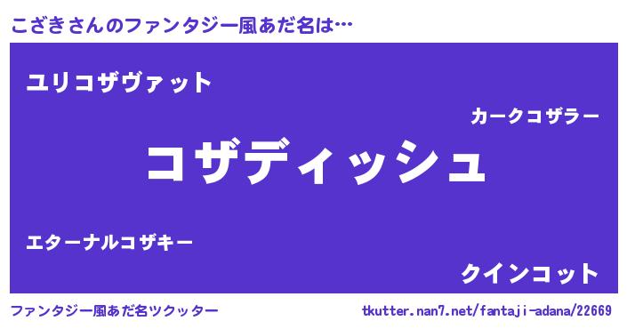 | 女子向けラノベタイトル風あだ名 | 『こざきの契約王妃』『こざき恋絵巻』 |