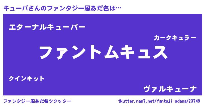 | 男性向けラノベタイトル風あだ名 | 『キューパの嫁は女の子じゃないと思った?』 |