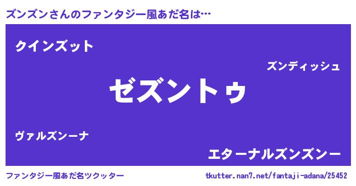 | 男性向けラノベタイトル風あだ名 | 『Re:ズンズンから始める異世界生活』 |