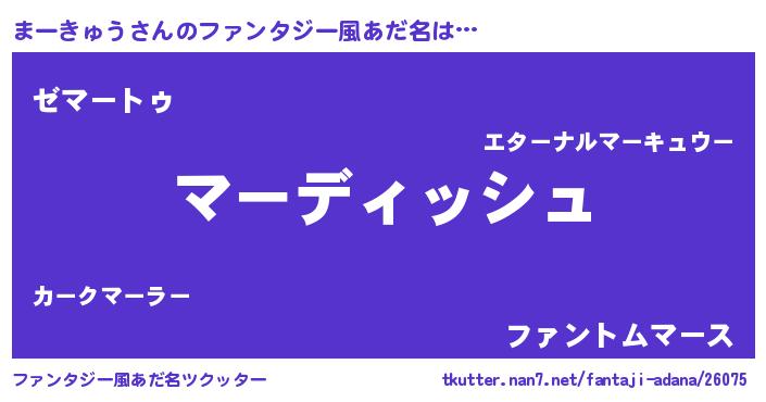 | 男性向けラノベタイトル風あだ名 | 『まーきゅうという概念が存在しない退屈な世界 』 |