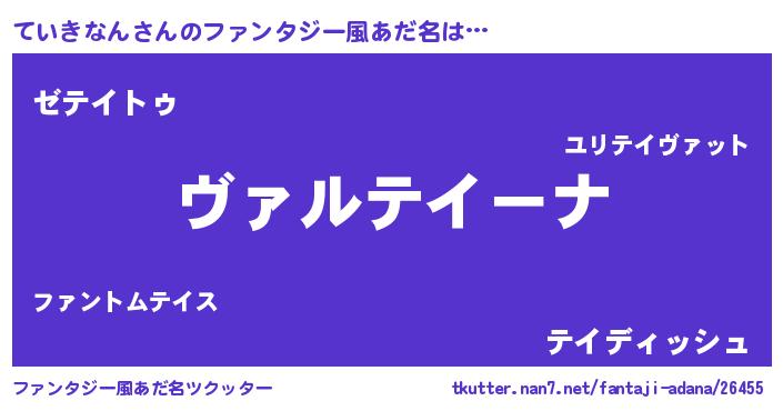 | 男性向けラノベタイトル風あだ名 | 『魔弾の王とていきなん』 |