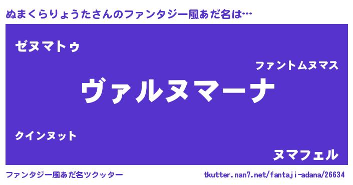 | 男性向けラノベタイトル風あだ名 | 『魔弾の王とぬまくらりょうた』 |