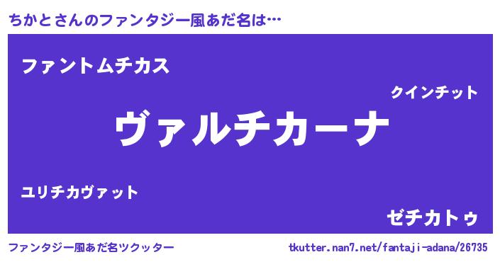 | 男性向けラノベタイトル風あだ名 | 『魔弾の王とちかと』『チカトスレイヤー』 |