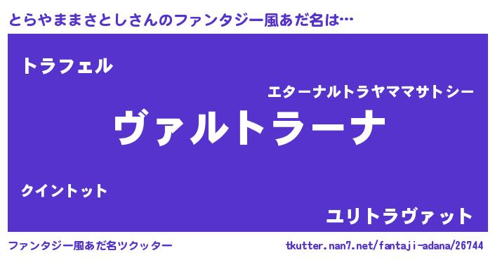 | 男性向けラノベタイトル風あだ名 | 『魔弾の王ととらやままさとし』 |